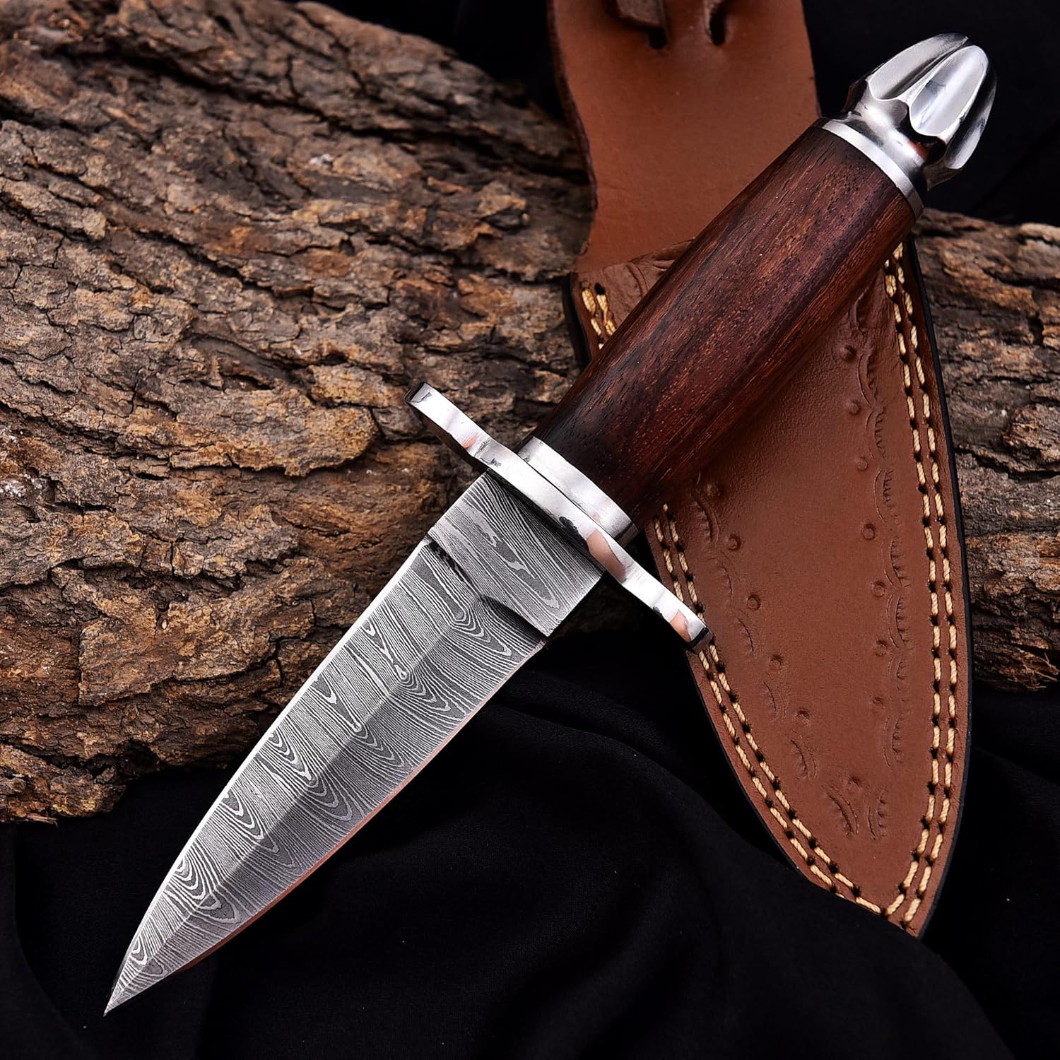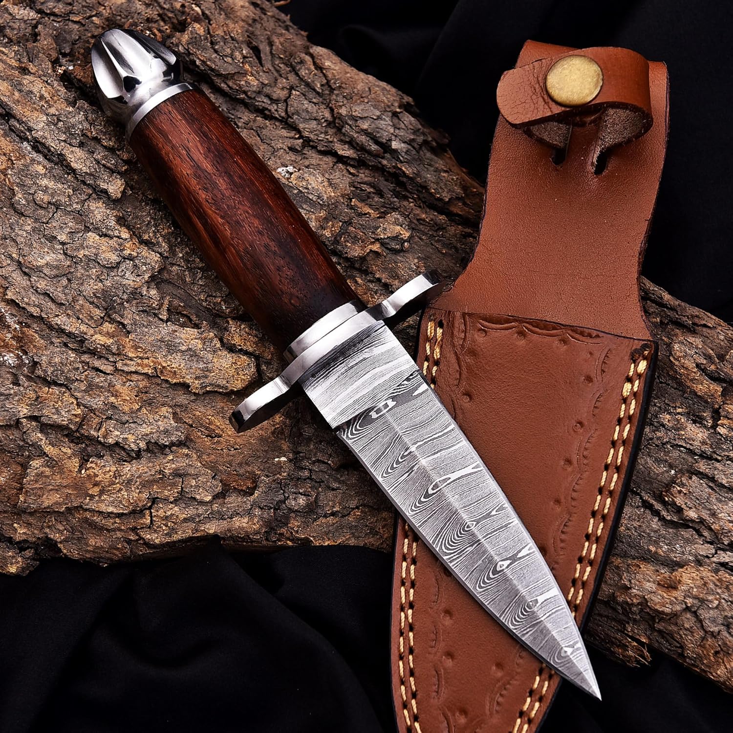 The Damascus Dagger by FBcrafts is a premium, hand-forged double-edge knife designed for hunting, camping, and everyday carry (EDC). Crafted with genuine Damascus steel and a rosewood handle, this dagger delivers exceptional durability, edge retention, and ergonomic comfort.