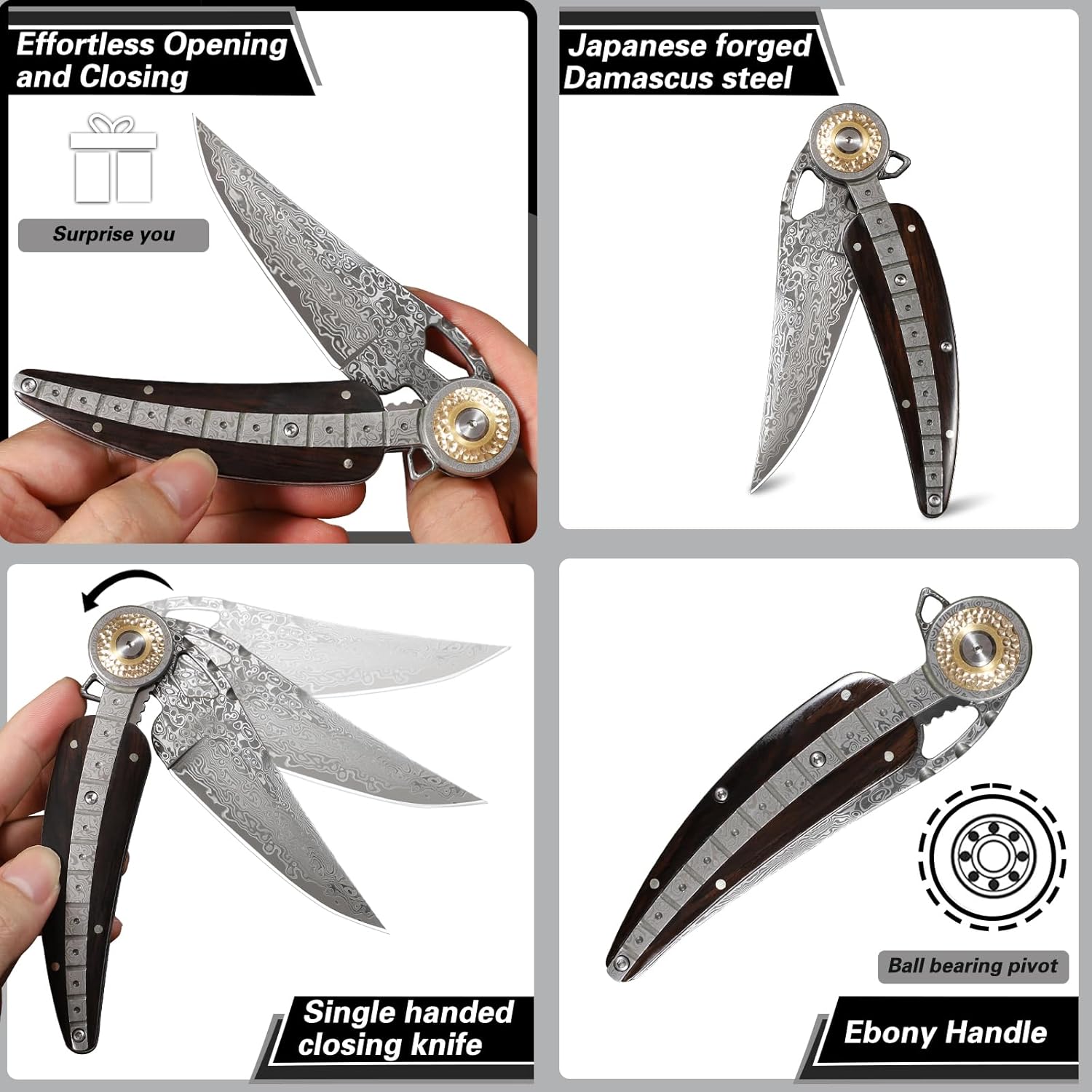 The Handmade Damascus Folding Knife features a 3.4-inch Japanese forged blade with a feather-shaped ebony handle for precision, comfort, and style. Lightweight and foldable, it’s ideal for camping, hiking, hunting, or everyday carry. Includes a hand-engraved holster, making it perfect for collectors and outdoor enthusiasts.