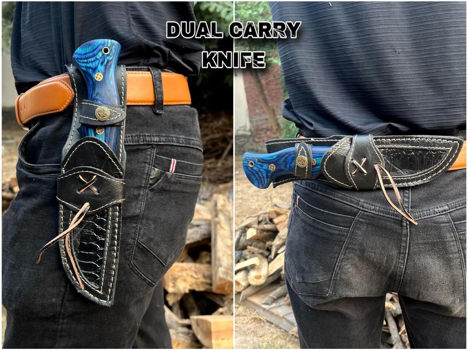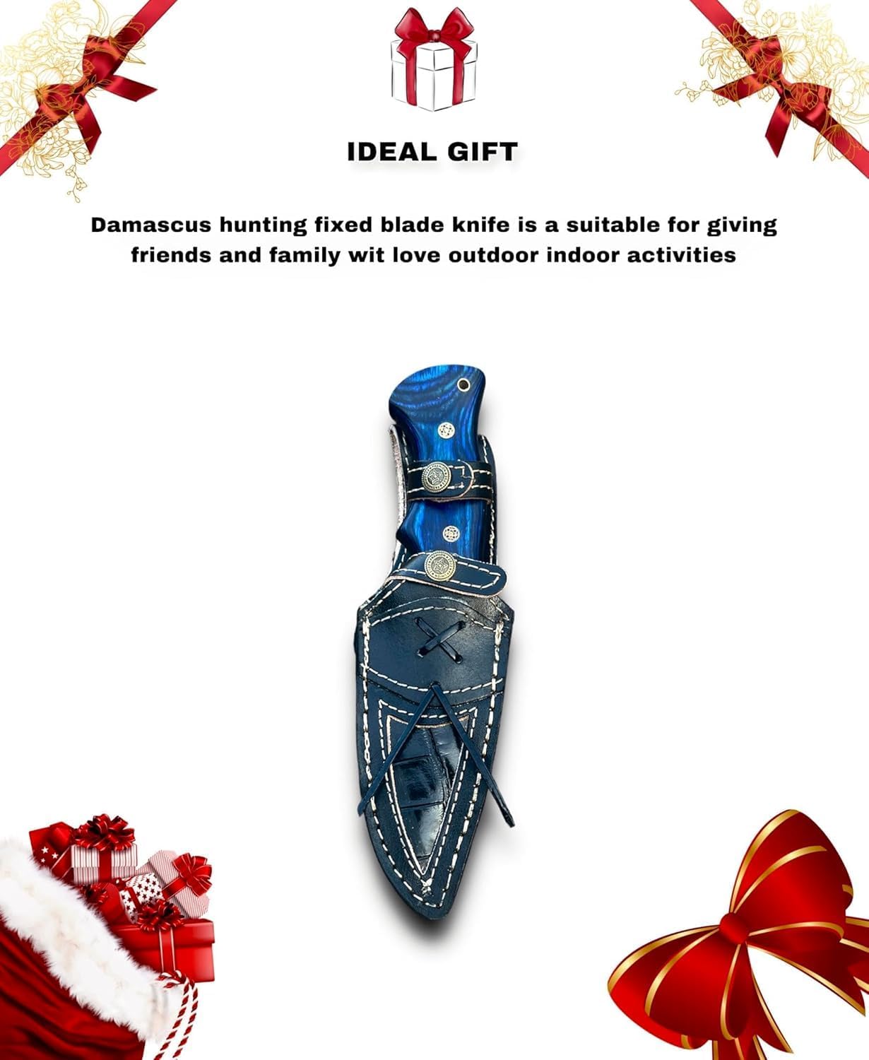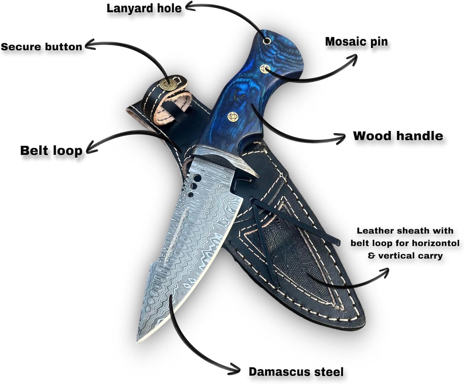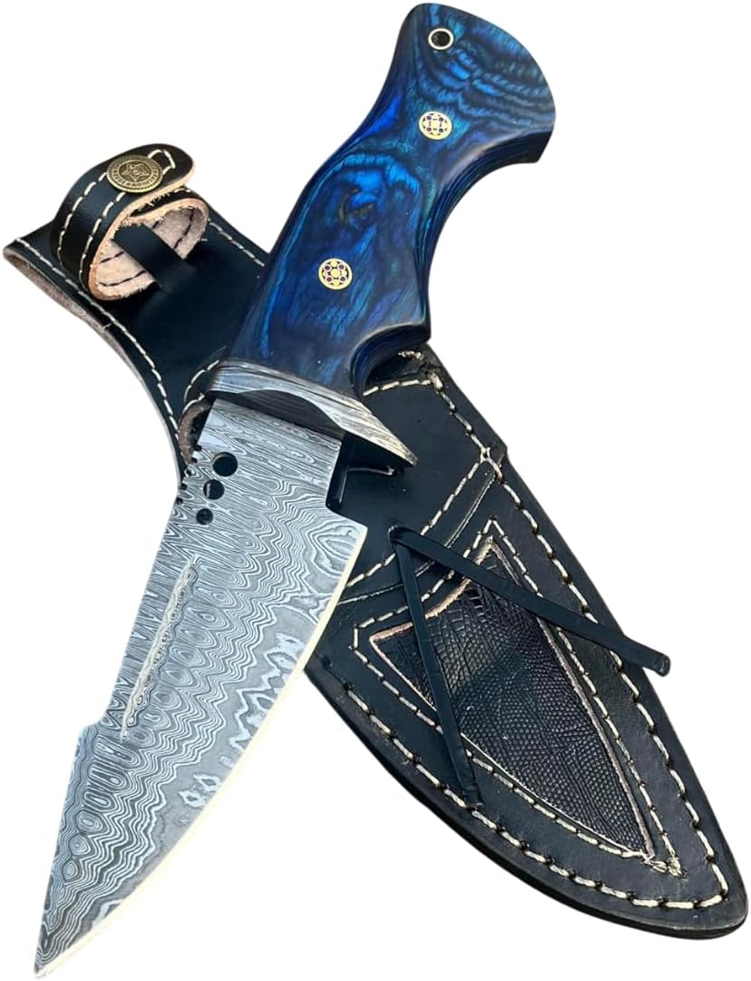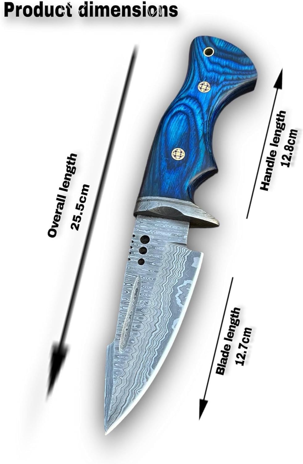 The Handmade Damascus Hunting Knife features a razor-sharp 4.9-inch Damascus steel blade and ergonomic blue Pakka wood handle. Lightweight and full tang, it’s perfect for bushcraft, camping, hunting, and EDC. Includes a durable leather sheath for safe carry and reliable outdoor performance.