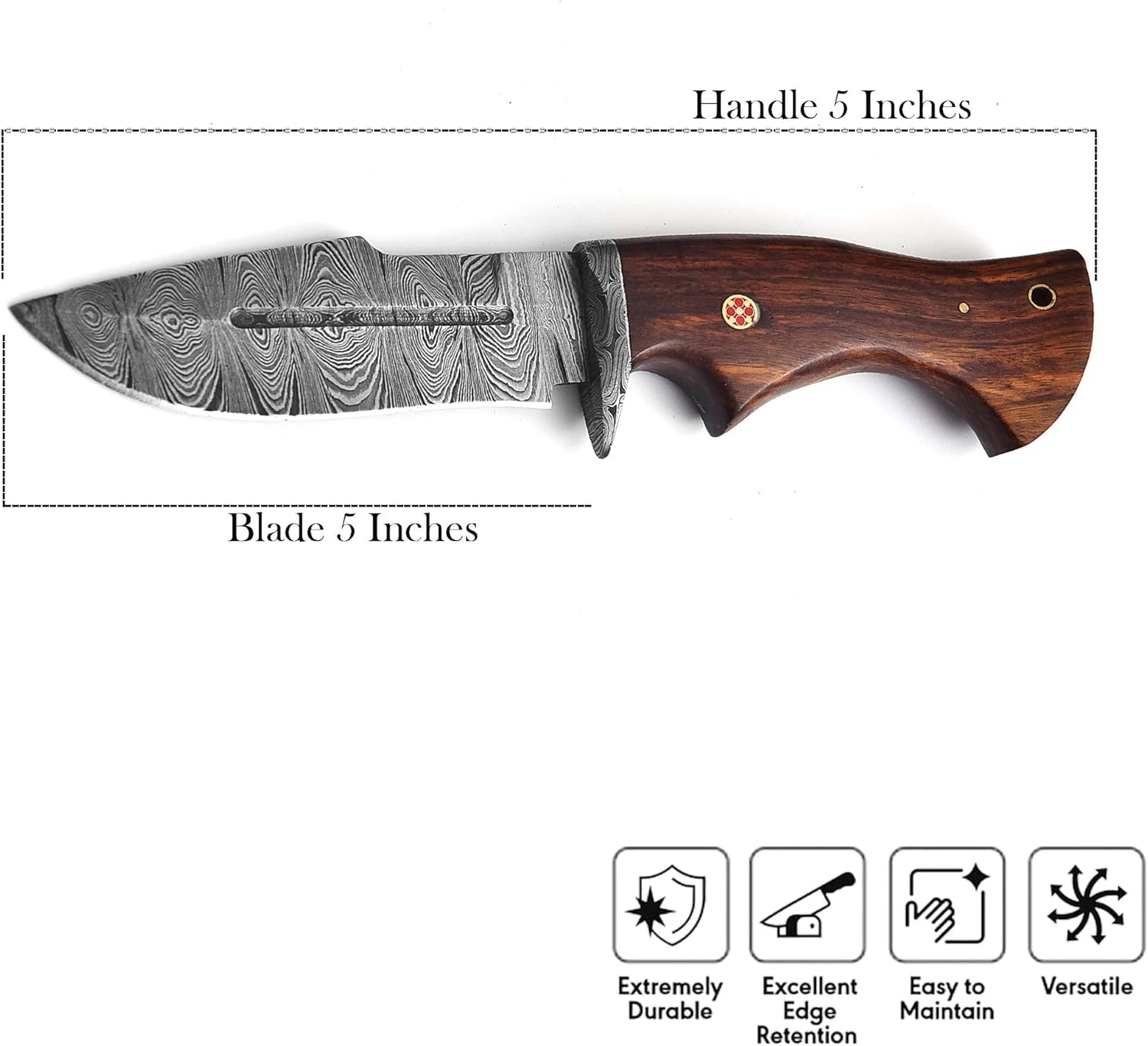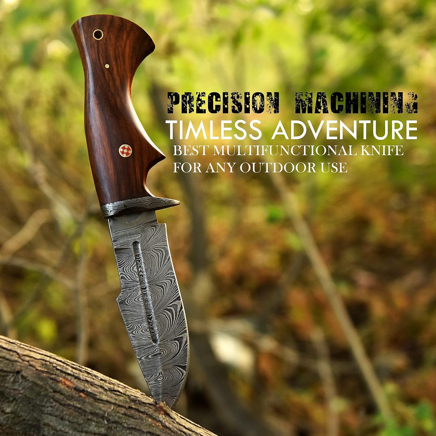 The Damascus Hunting Knife features a razor-sharp 288-layer Damascus steel blade, ergonomic walnut wood handle, and full tang construction for strength and balance. Its premium leather sheath ensures safe carry. Perfect for hunting, camping, bushcraft, skinning, and outdoor adventures, this handmade knife is a reliable, professional-grade tool.