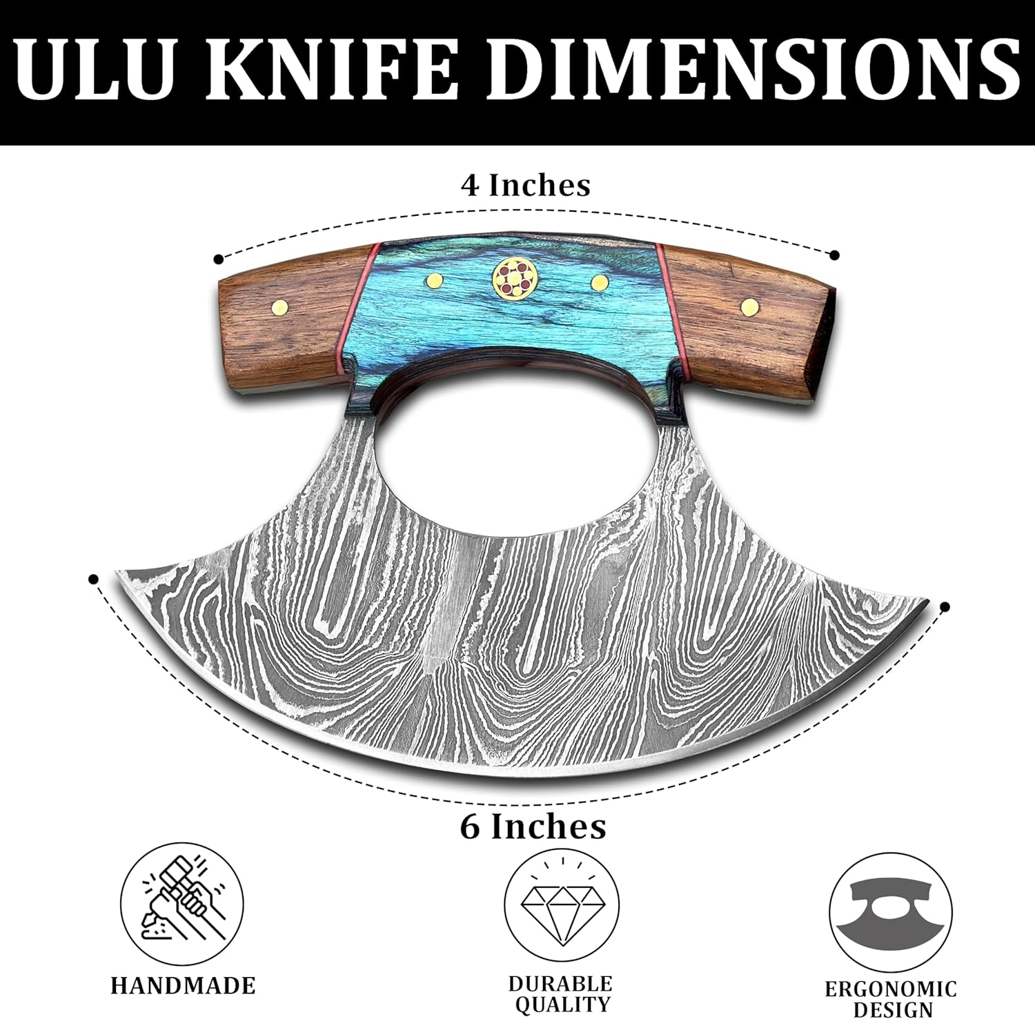 The Damascus Knife is a versatile handcrafted Ulu knife made with 67 layers of high-carbon Damascus steel. Its ergonomic curved blade design and durable rosewood handle make it ideal for chopping, mincing, rocking, slicing meat, and herbs. Comes with a genuine leather sheath for safe storage.