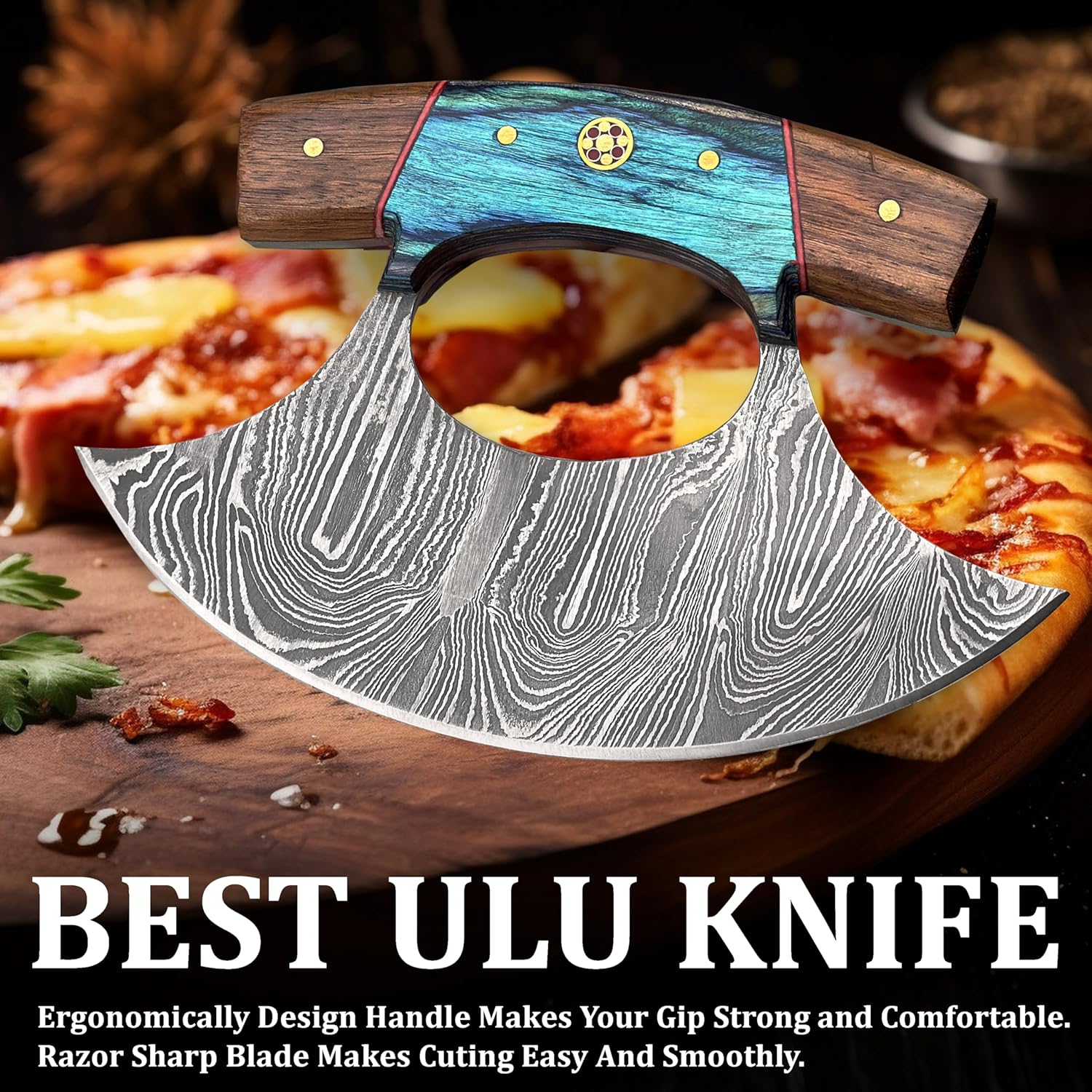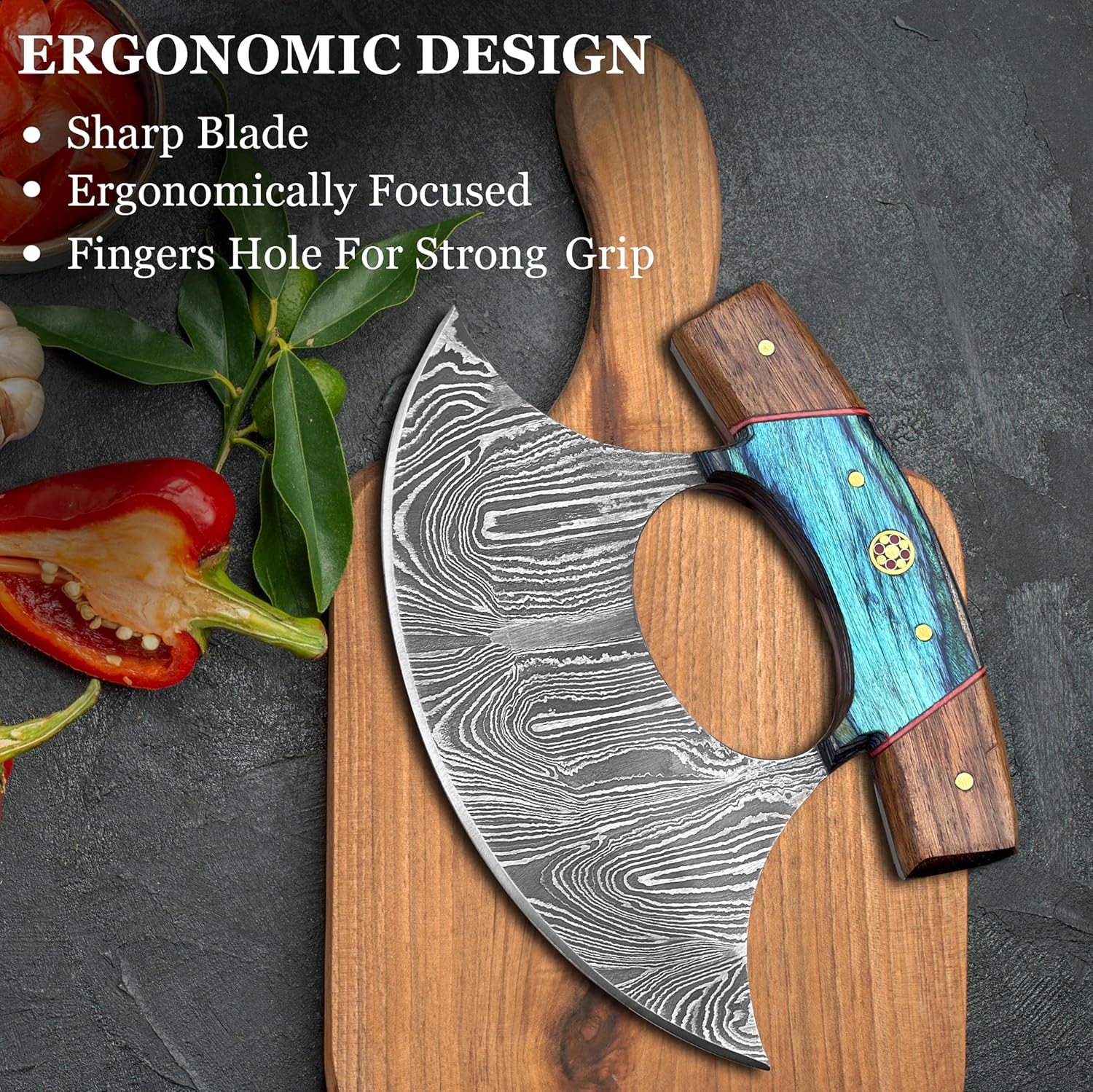 Ergonomic Ulu-style curved blade reduces hand strain