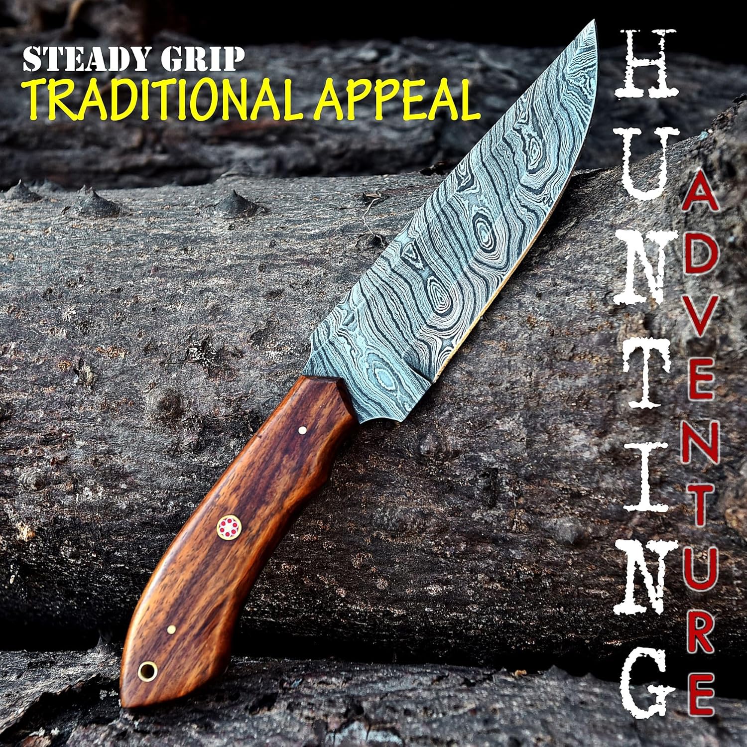 The Damascus Knife is a high-quality handmade hunting Bowie knife designed for outdoor enthusiasts. Crafted with full tang Damascus steel, it provides exceptional sharpness, durability, and balance. The ergonomic rosewood handle ensures a comfortable grip for hunting, camping, hiking, and survival tasks.