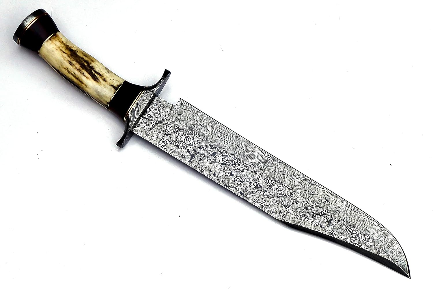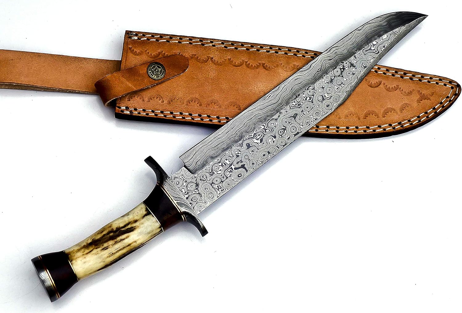 Handmade Damascus Knife with Elk Deer Horn Handle & Sheath mega blades