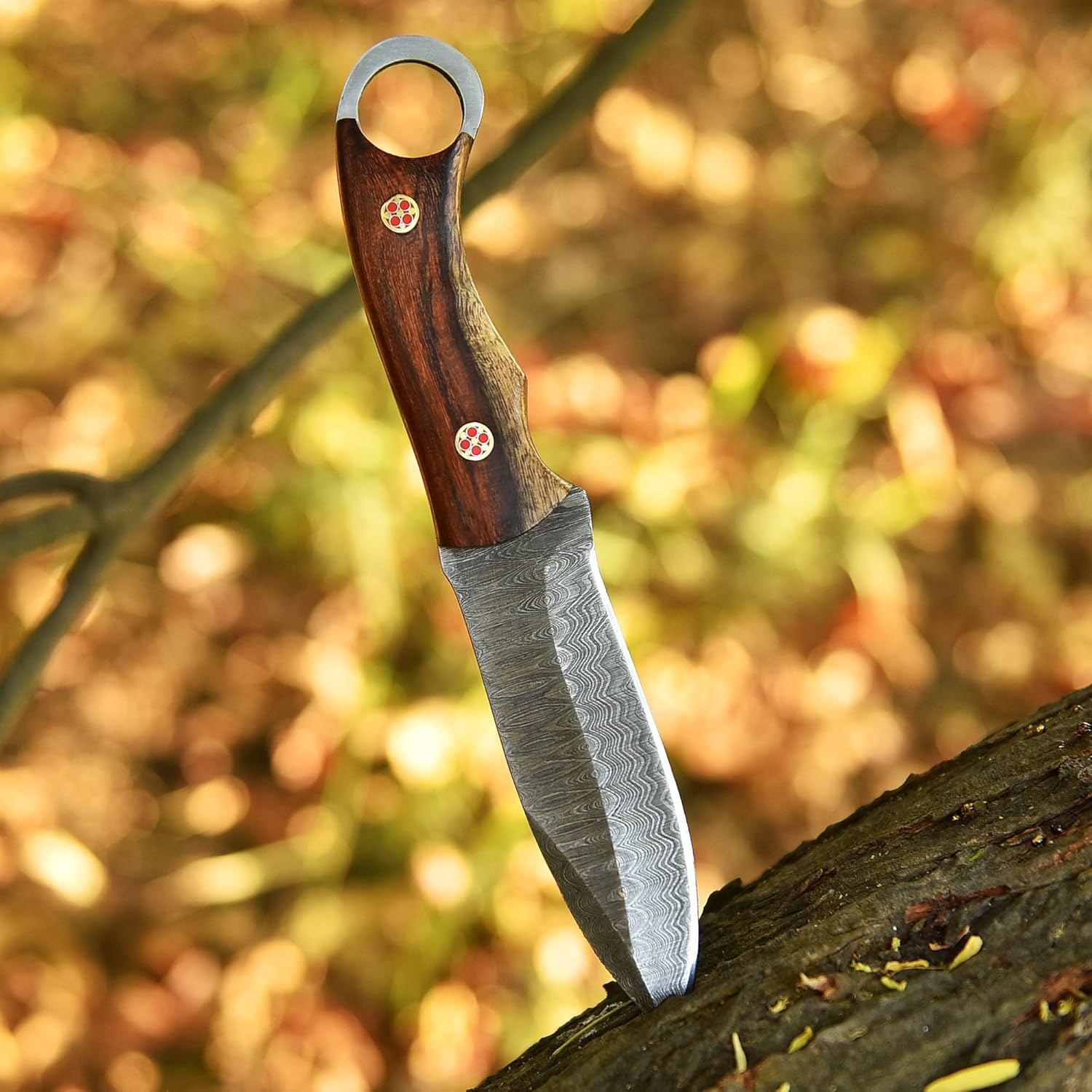 The Damascus Knife provides precise cutting, excellent edge retention, and durability for all outdoor activities. Its ergonomic handle reduces hand fatigue, while the full tang blade ensures strength for skinning, slicing, chopping, or general survival tasks.