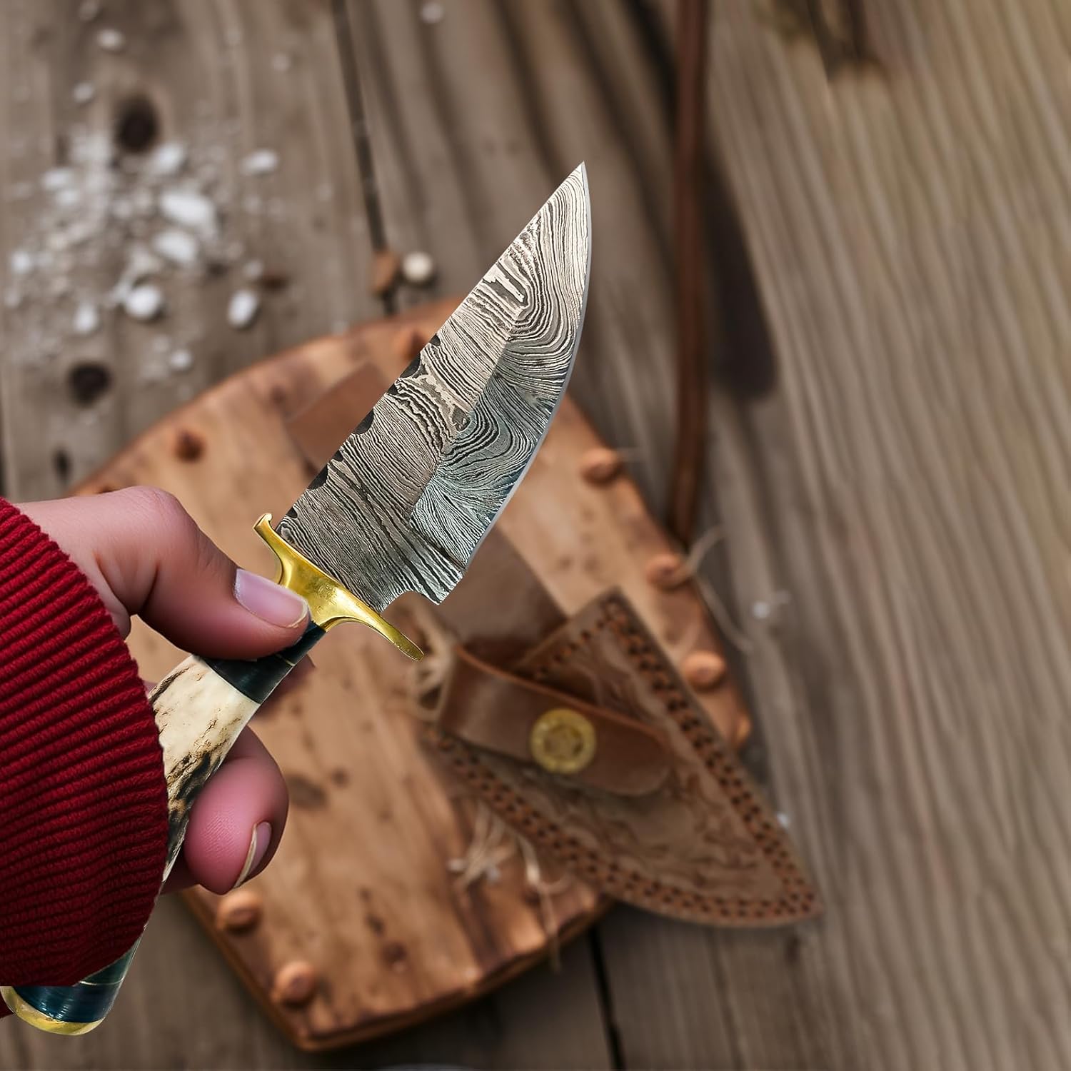 The Handmade Damascus Stag Antler Knife is a compact yet powerful outdoor tool designed for hunters, campers, and EDC users. Fire-forged Damascus steel delivers razor-sharp performance, while the natural stag antler handle provides durability, comfort, and a timeless rustic look.