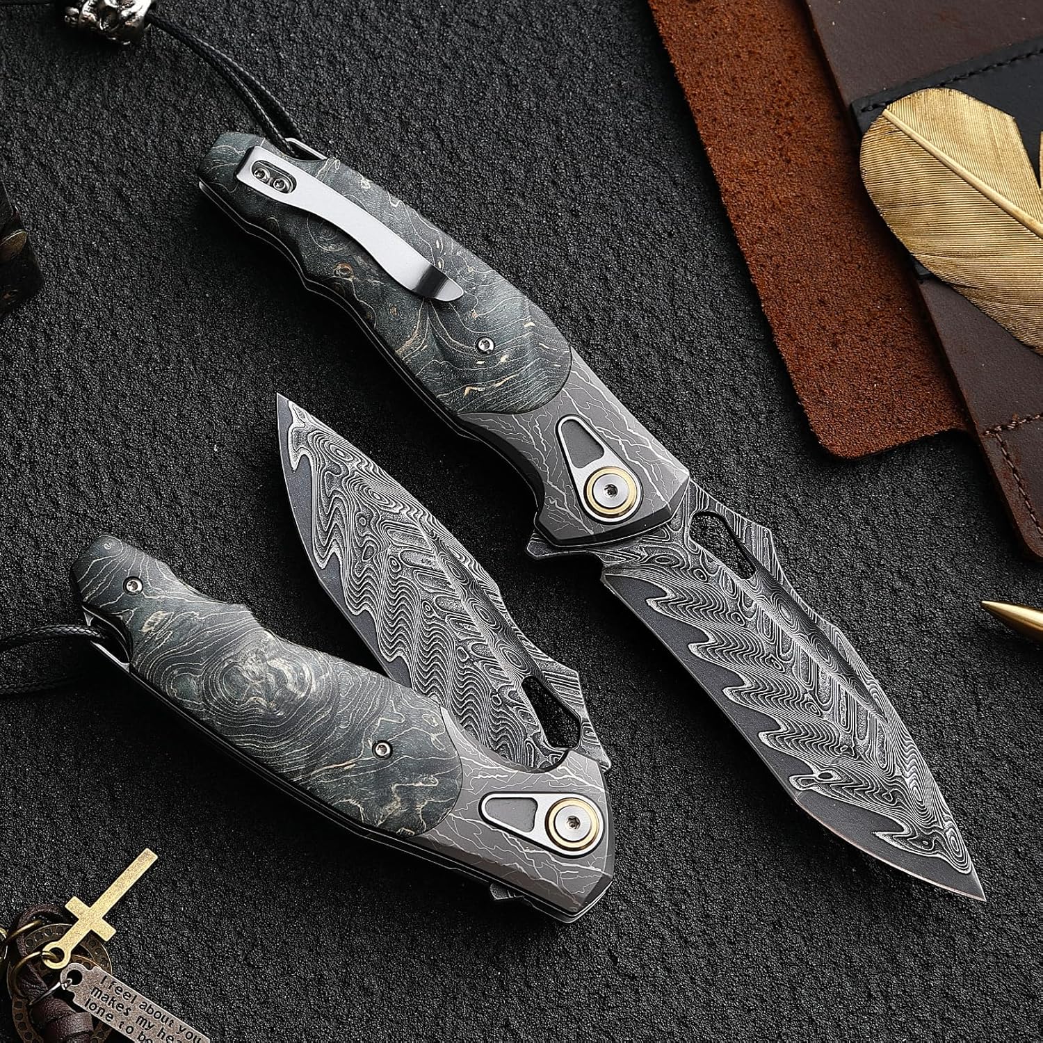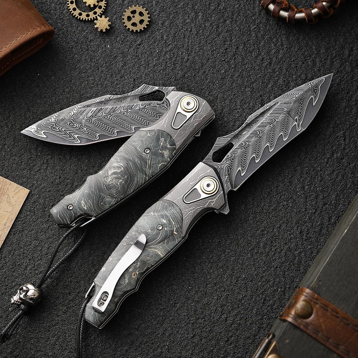 Handmade Damascus Steel Pocket Knife with Stabilized Wood Handle mega blades