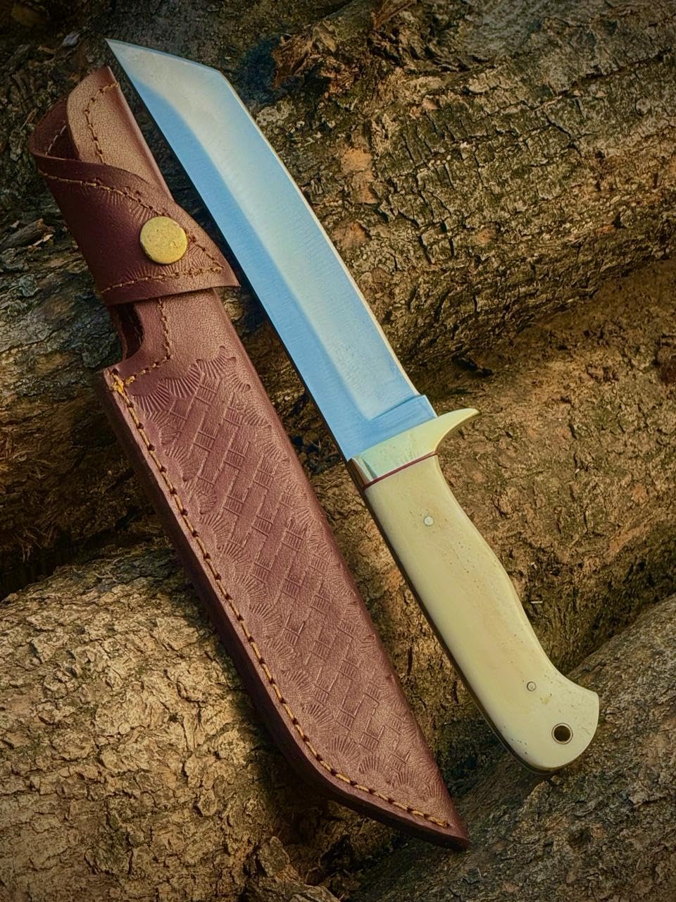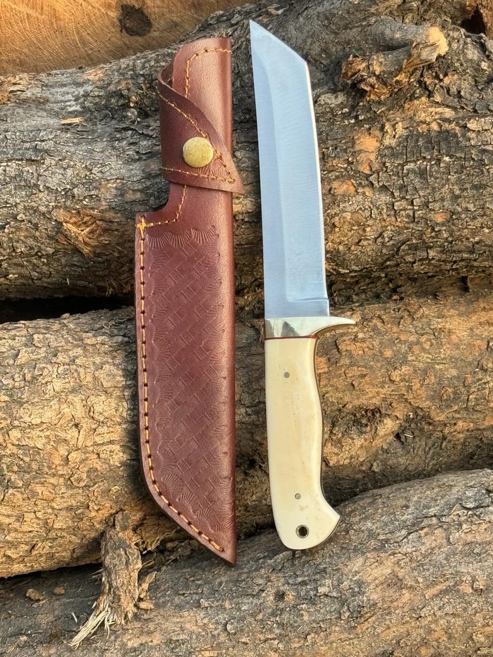 The Handmade Hunting Knife is a premium fixed blade tanto knife crafted for outdoor enthusiasts. Made from high-quality 1095 carbon steel with a leather handle, this knife is perfect for hunting, skinning, camping, and survival tasks. It comes with a durable leather sheath for safe and convenient carrying.