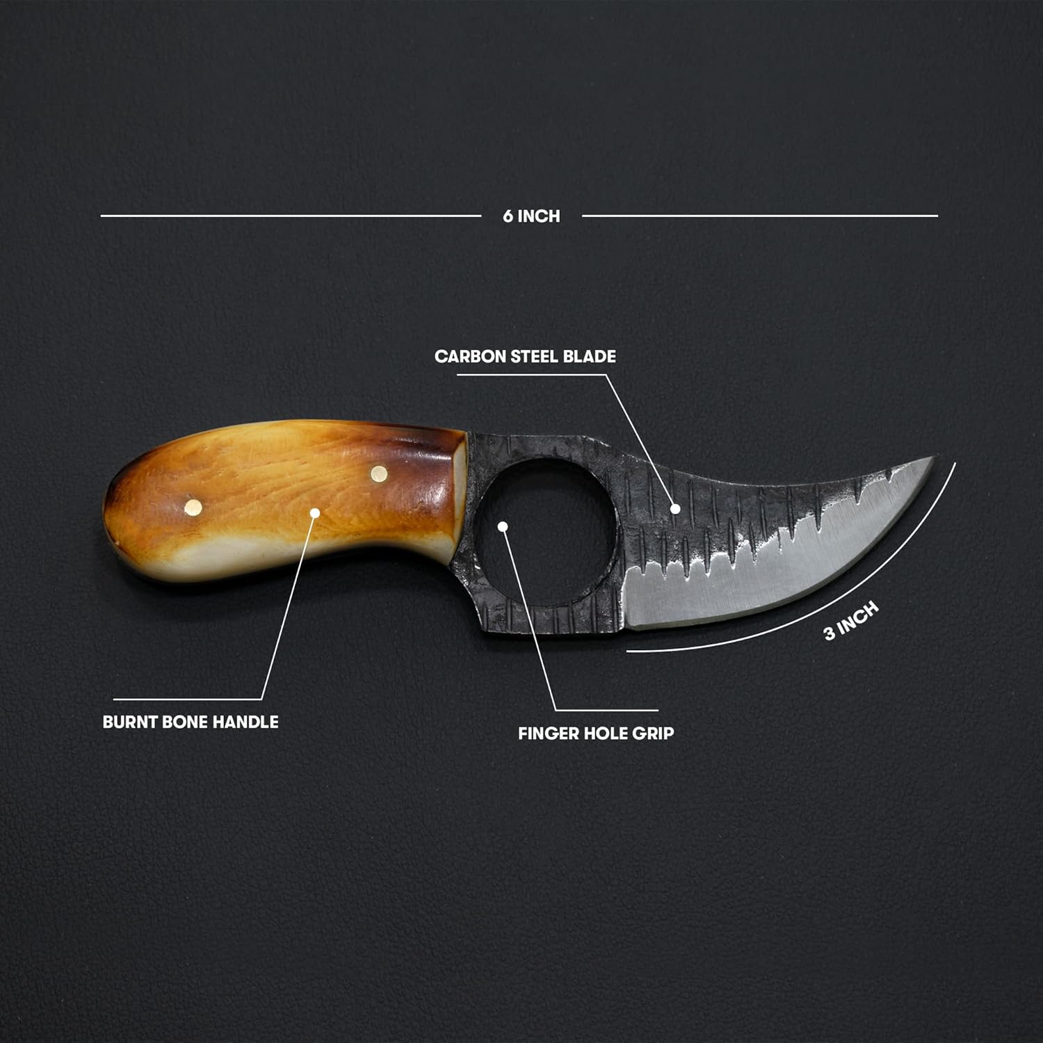 🪵 Hand-Forged Bone Handle: Burnt bone handle with custom carved grip ensures comfort and secure hold.