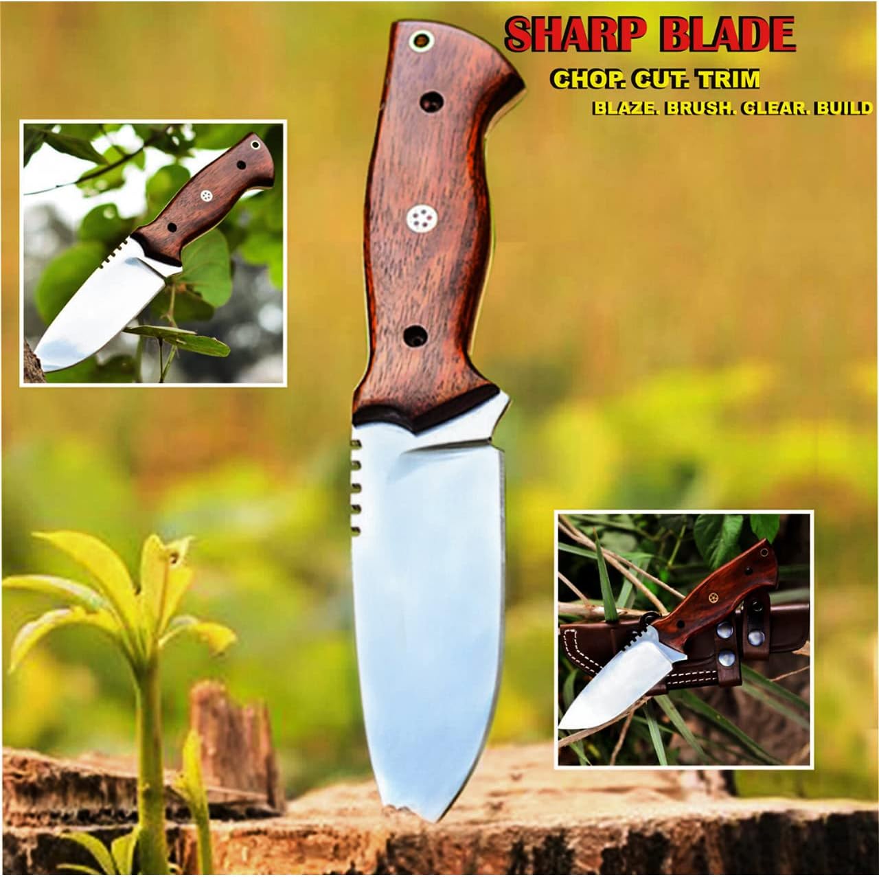 Horizontal Carry Knife with Rosewood Handle & Leather Sheath mega blades