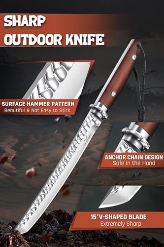 This Wooden Handle Survival Knife stands out through its fusion of artistry and performance. The hammered blade texture enhances cutting efficiency while adding visual character. The polished rosewood handle provides both elegance and durability, offering a secure, comfortable grip for extended outdoor use. Paired with an embossed leather sheath, it delivers premium craftsmanship with collectible appeal.