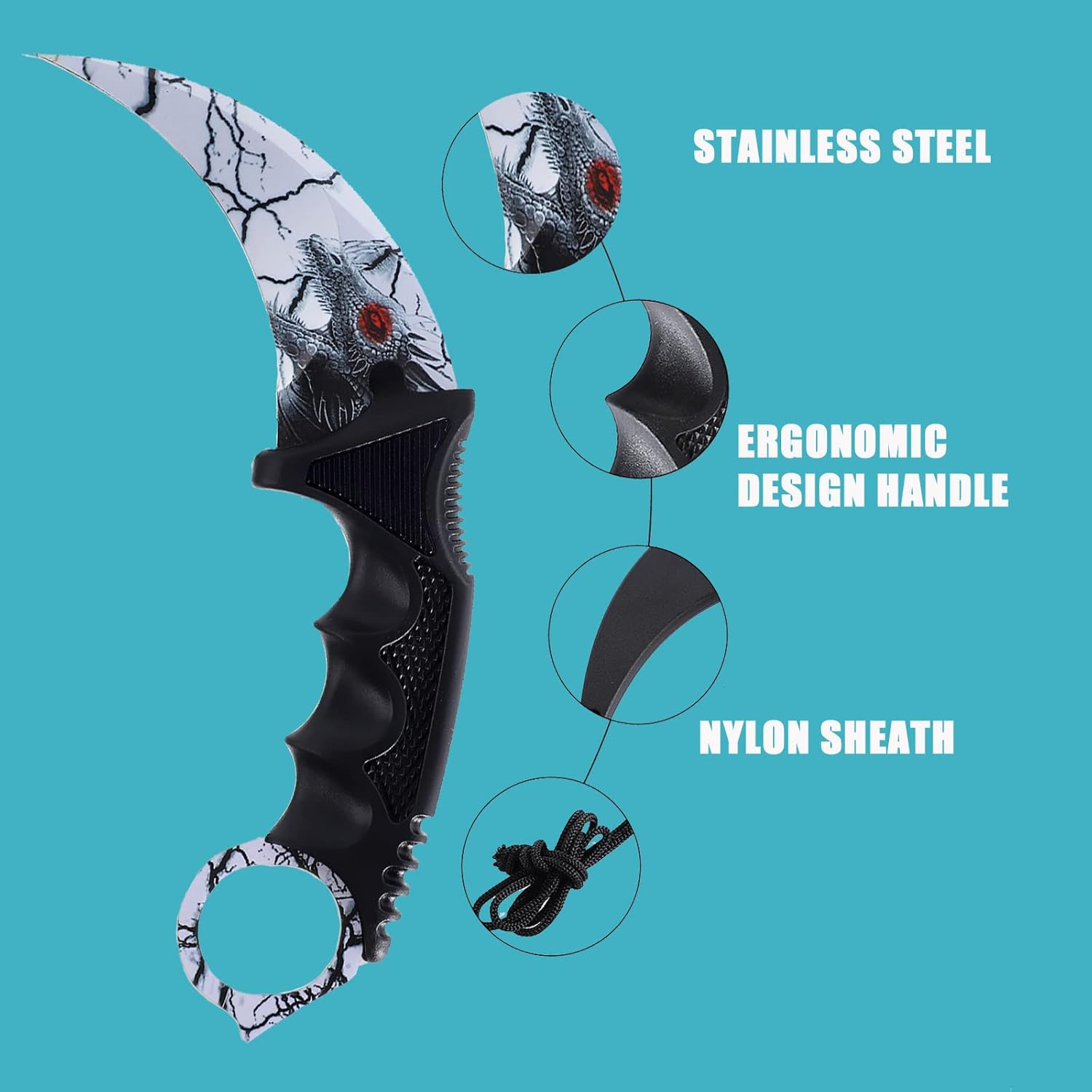 This Karambit Knife set includes two fixed blade tactical knives made from stainless steel for sharp, reliable performance. Lightweight and easy to carry, each knife features a non-slip ergonomic handle and protective sheath. Perfect for camping, hiking, survival, hunting, and outdoor adventures.