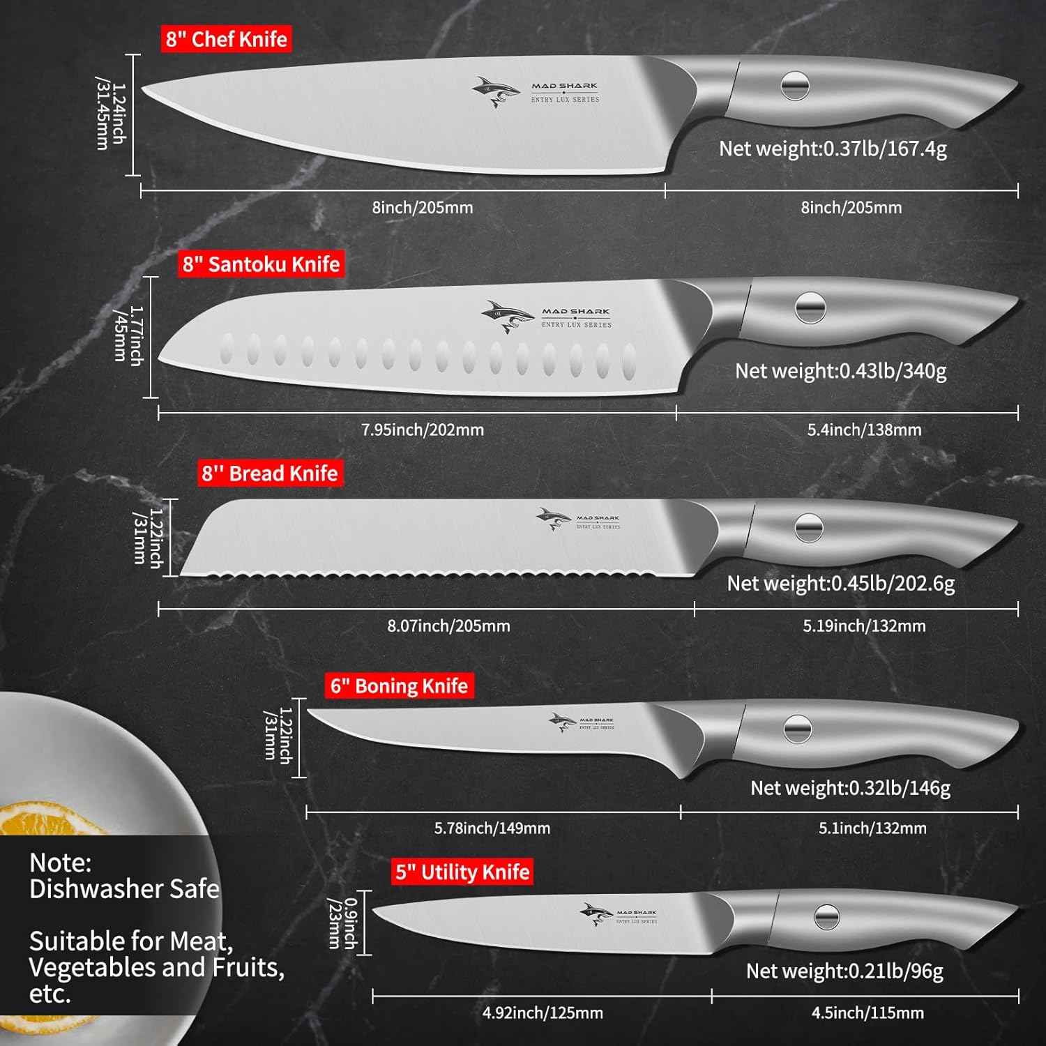 Upgrade your kitchen with the MAD SHARK 5PCS Kitchen Knife Set, designed for versatile and professional food preparation. With premium German stainless steel blades, ergonomic handles, and full-tang construction, this knife set makes slicing, dicing, chopping, and carving effortless.