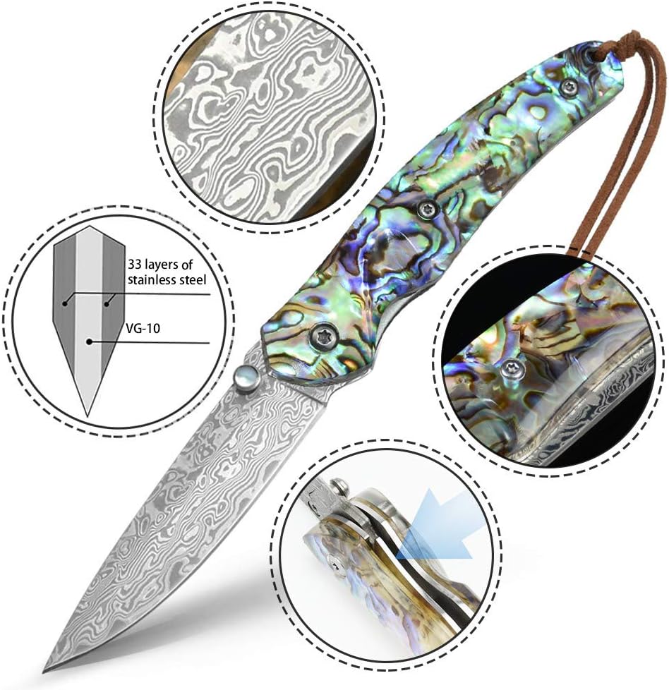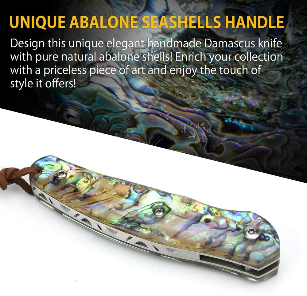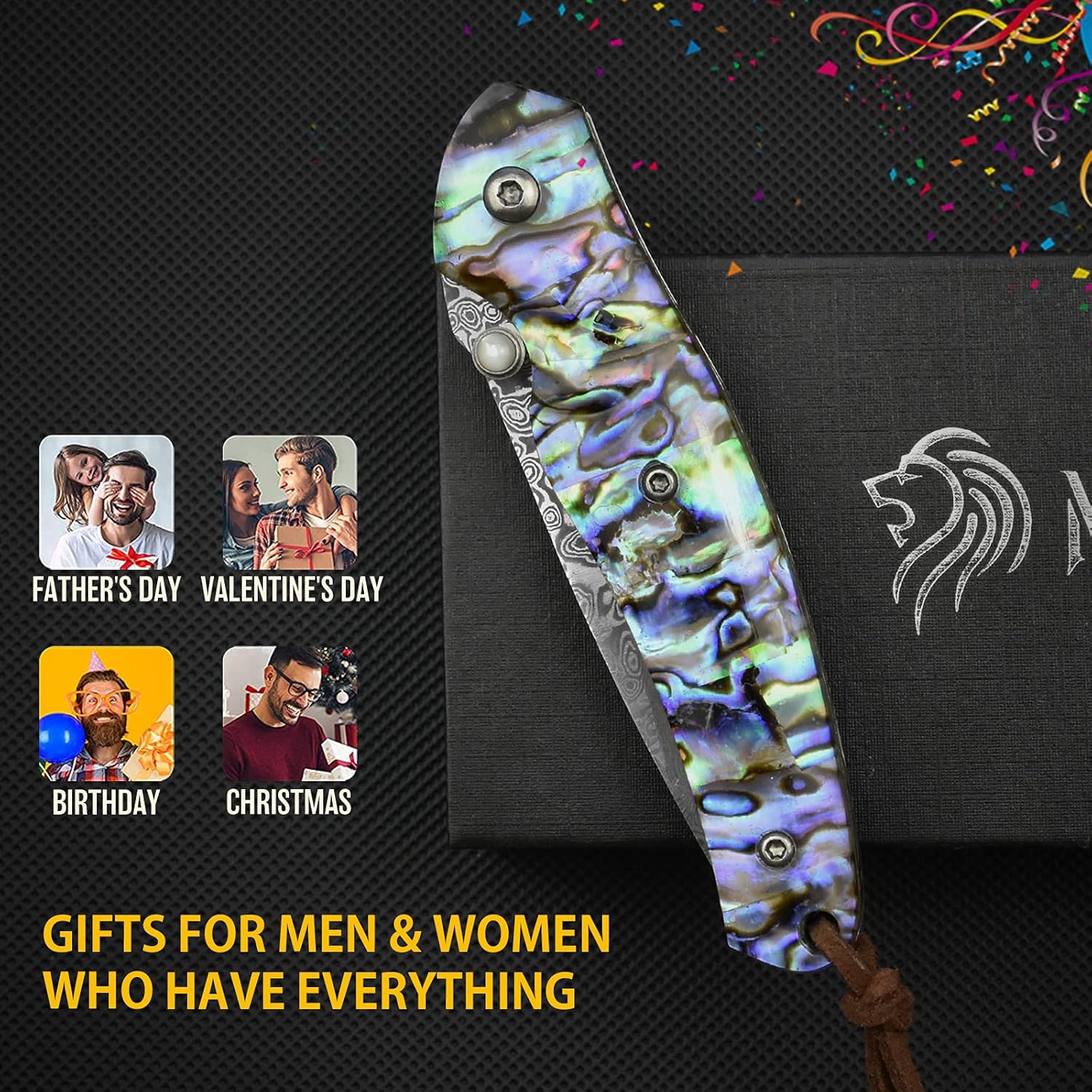 The NedFoss Damascus Pocket Knife features a 67-layer Damascus steel blade and colorful abalone resin handle for comfort and style. Foldable with a liner lock, this lightweight knife is perfect for EDC, camping, hiking, and survival. A premium gift choice for men, women, and collectors alike.