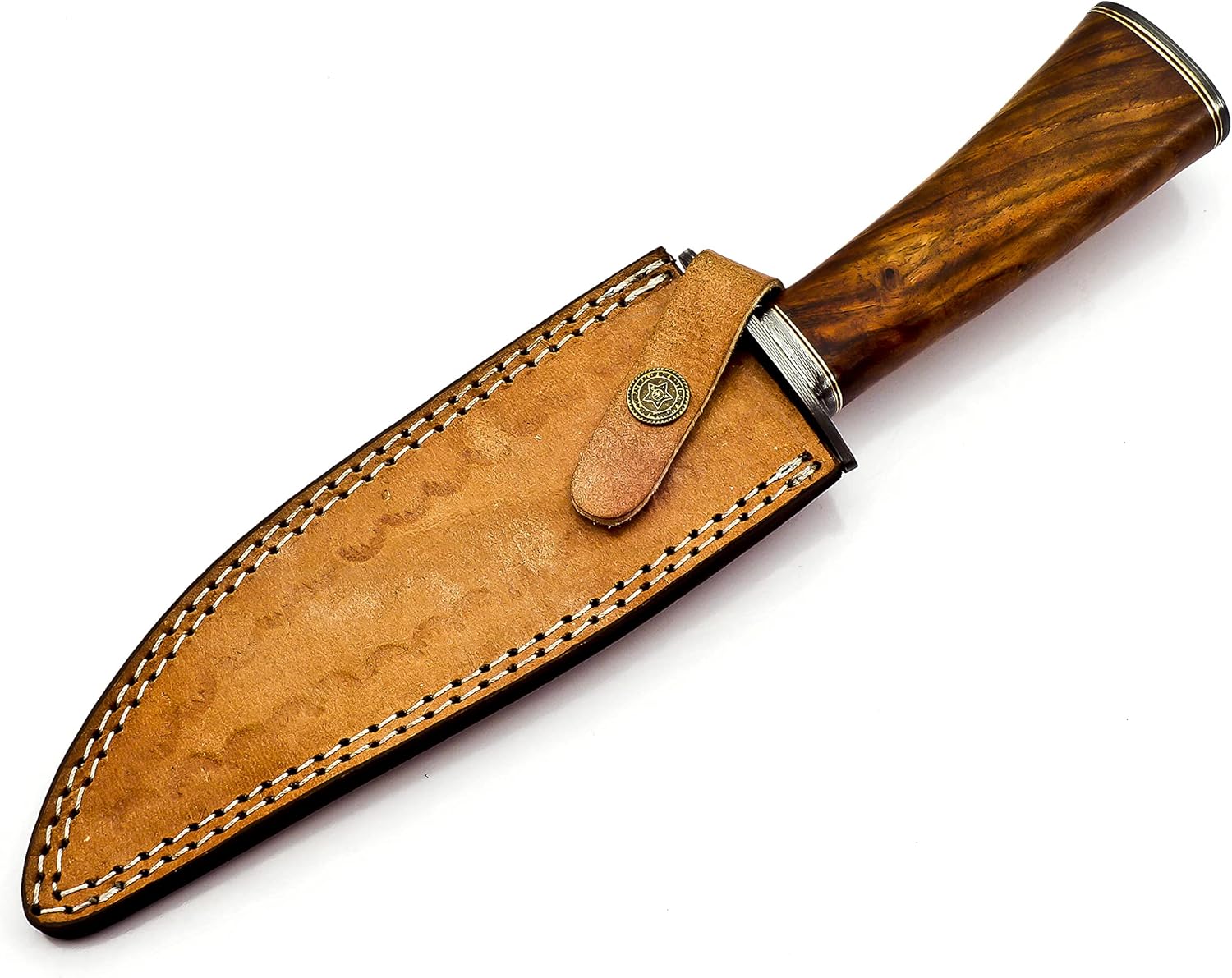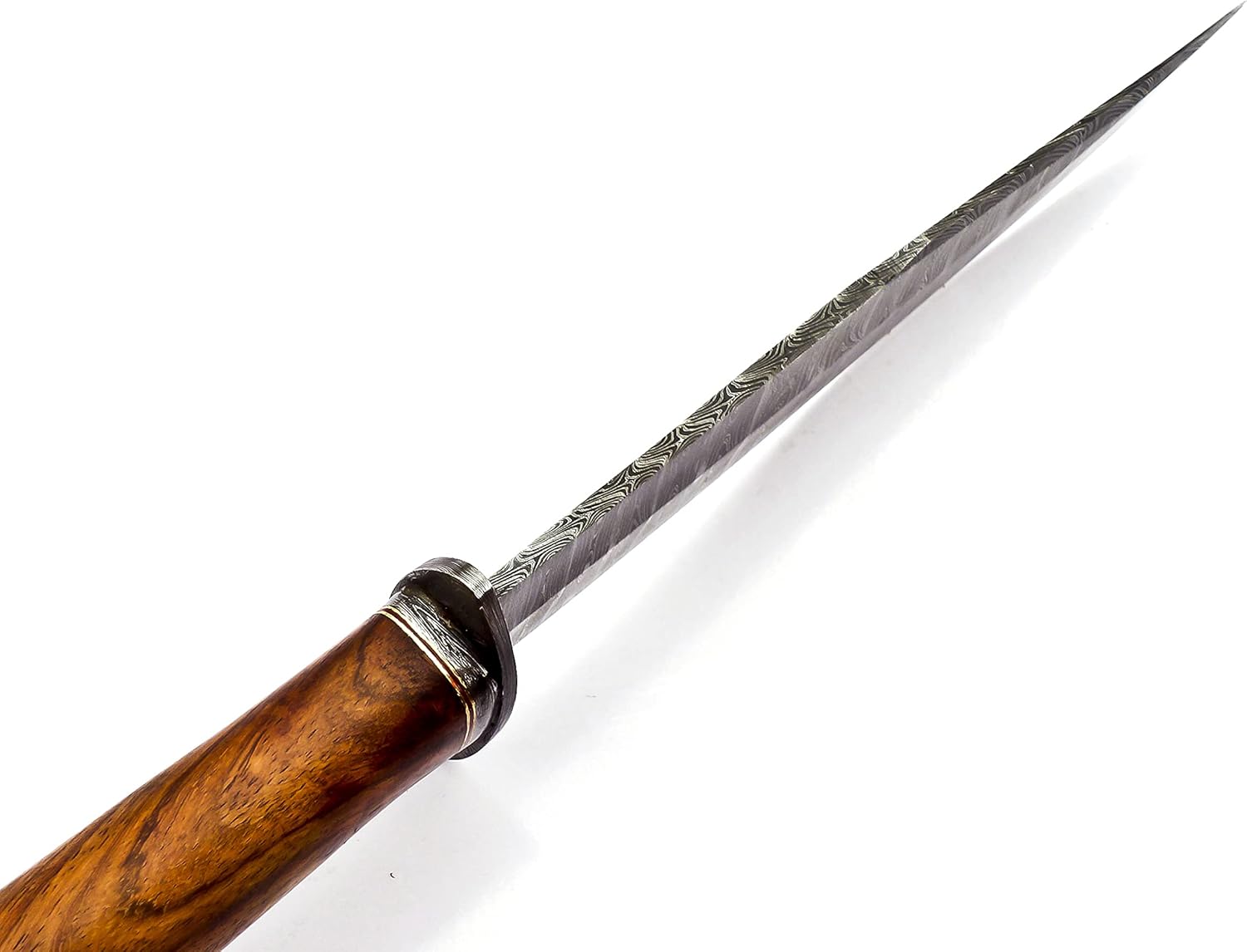 Damascus steel layers provide strength, durability, and aesthetic appeal