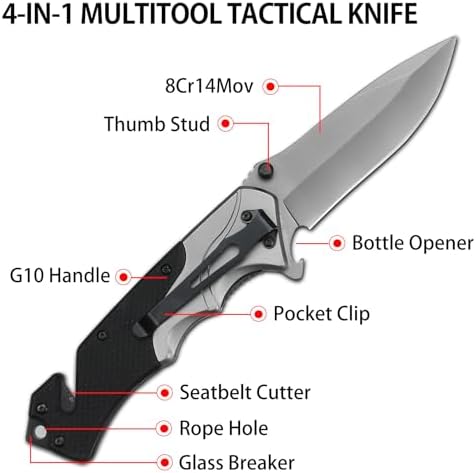 • 4-in-1 multifunction design: large blade, glass breaker, seat belt cutter, bottle opener