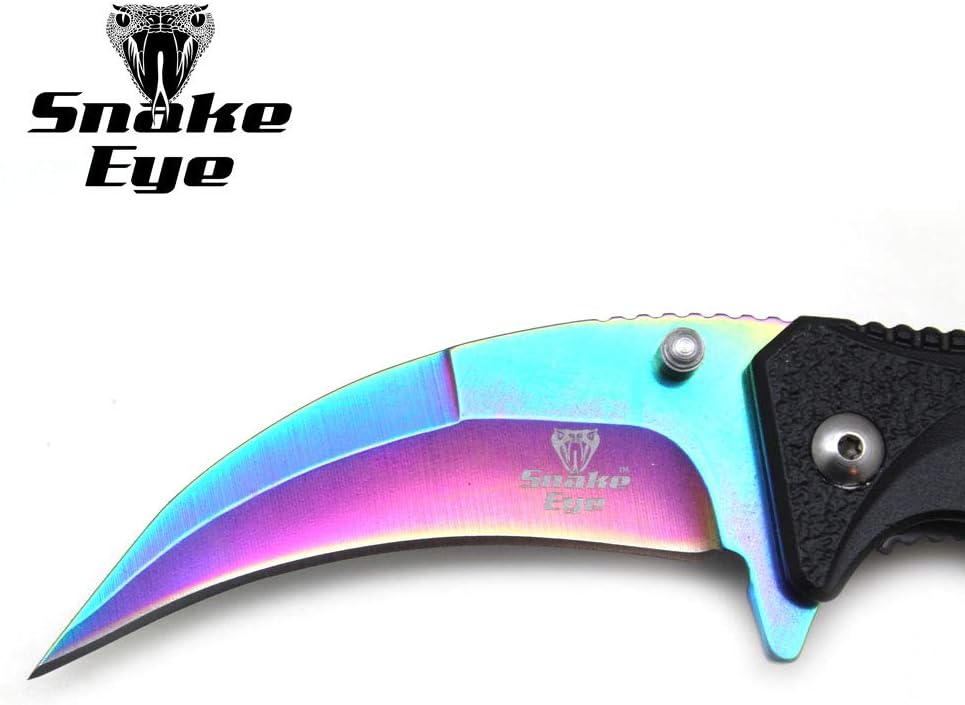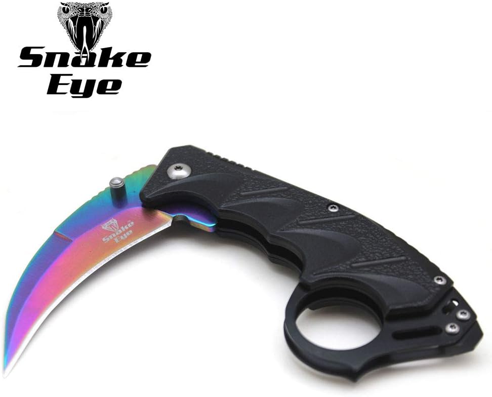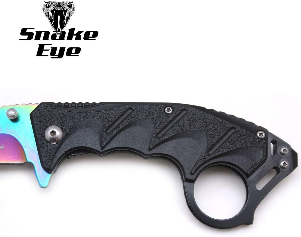 The Snake Eye Tactical Folding Pocket Knife features a 3.85” alloy steel blade with a rainbow aluminum handle for a secure grip. Lightweight and compact, it includes a flip function and pocket clip for easy EDC. Perfect for camping, hunting, outdoor adventures, and everyday carry.