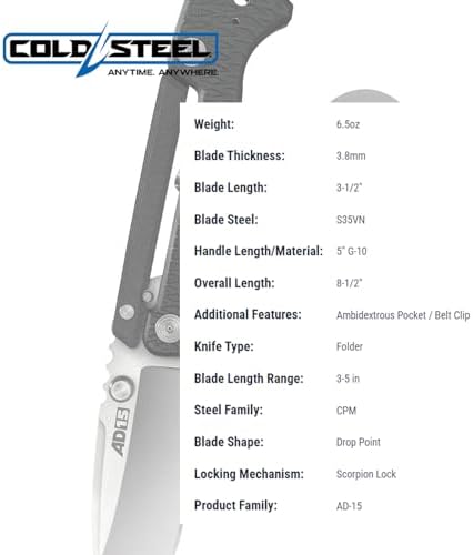 Feature Details Model AD-15 Tactical Folding Knife Blade Steel S35VN Stainless Steel Blade Length 3 1/2 in Blade Thickness 3.8 mm Blade Shape Drop Point Handle Material 5″ G-10 / 6061 Aluminum Yoke Locking Mechanism Scorpion Lock Overall Length 8 1/2 in Weight 6.5 oz (184.3 g) Knife Type Folding Pocket/Belt Clip Ambidextrous